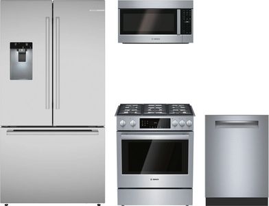 Bosch 4 Piece Stainless Steel Kitchen Package with French door refrigerator, built in dishwasher, slide in gas range and over the range microwave.Read More